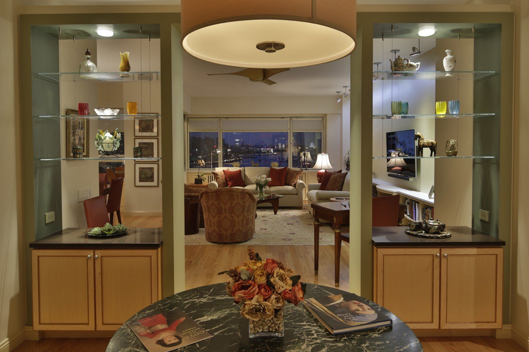Gut renovation, interior design, furniture and furnishings for a two bedroom, 2 ½ bath post war Manhattan coop apartment with an unusual and spectacular view north over the confluence of the East and Harlem Rivers; for an empty nesting couple returning to the city from the suburbs.