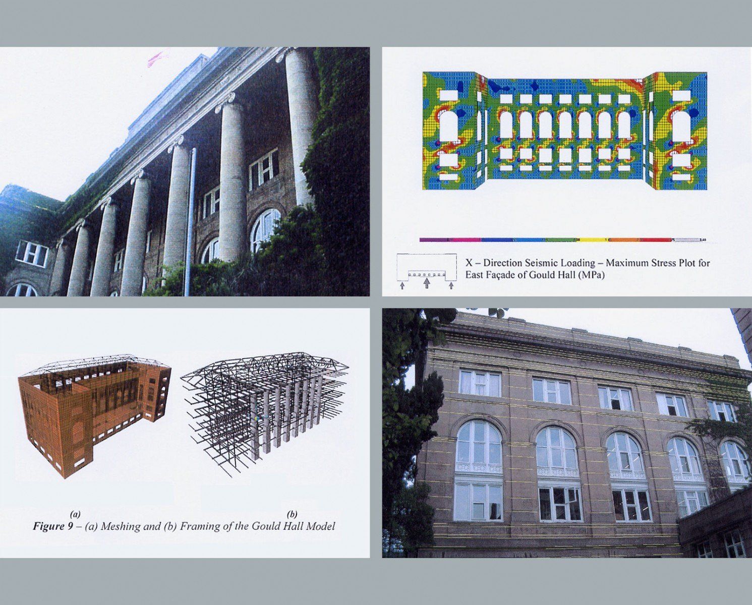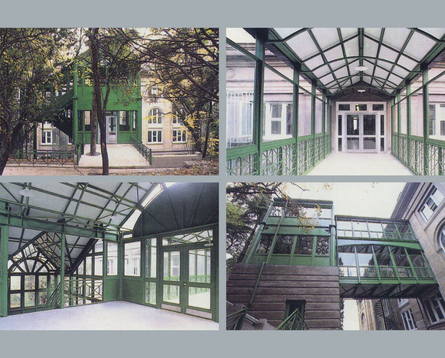 This bridge and stair tower was designed and built in response to the need to provide access for students and faculty arriving either by car or bus at the uphill side of the campus. The new structure provides direct access to the upper gallery level of the newly configured library in Gould Hall which recently replaced the original “Gymnatorium”